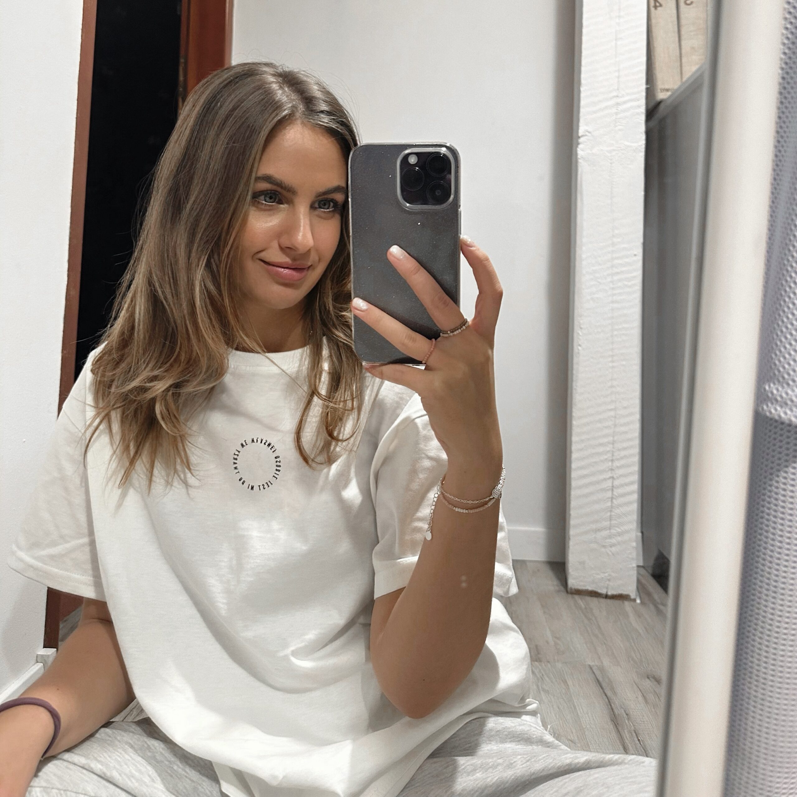 Koszulka z napisem „jest mi do twarzy we własnej osobie”.